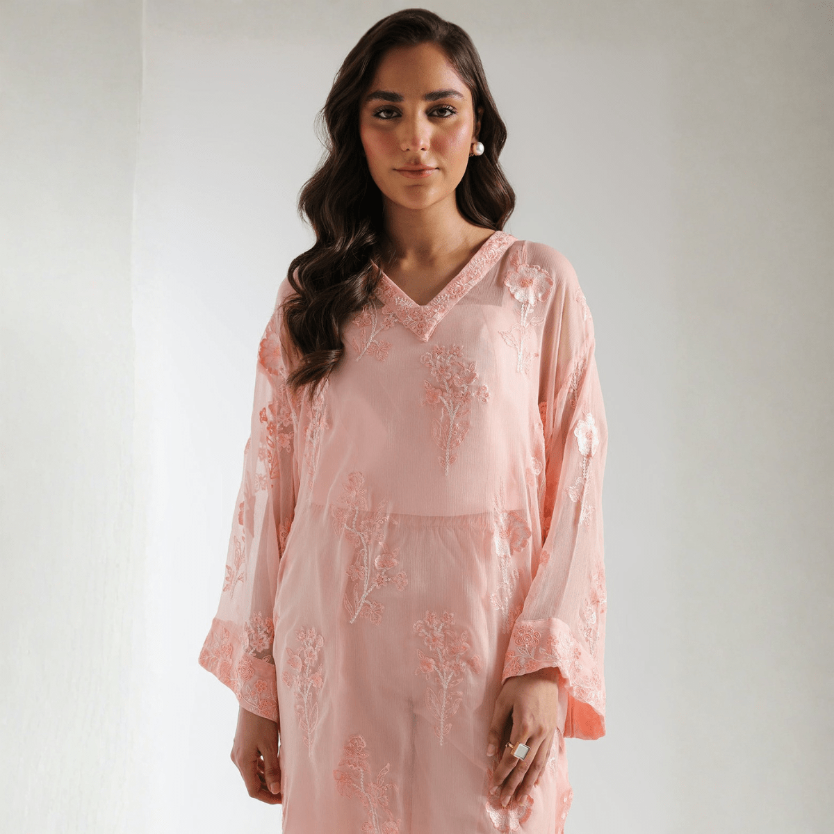 Add a touch of timeless elegance to your wardrobe with this ETHNC embroidered suit, a classically chic ensemble in a graceful powder pink shade. The straight-fit V-neck shirt with A-line hem is beautifully crafted with traditional floral embroidery, creating an effortless blend of heritage and modern style. Designed with full sleeves and regular length, it pairs perfectly with a sleeveless slip and embroidered culotte trousers, making it a versatile choice for casual gatherings, festive occasions, or summer evenings.